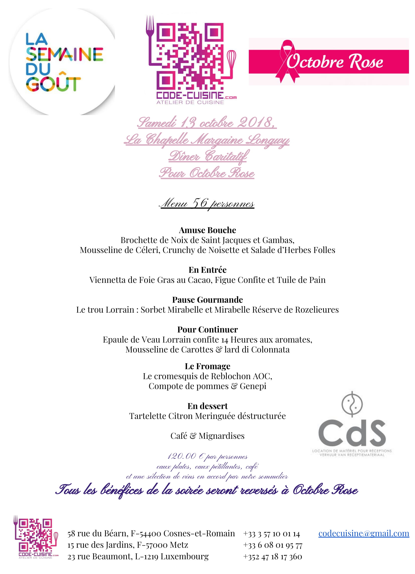 Comme chaque année Code Cuisine s’engage pour Octobre Rose lors de la semaine du goût en vous proposant un repas gastronomique dans un lieu d’exception ou tous les bénéfices seront reversés à l’association.