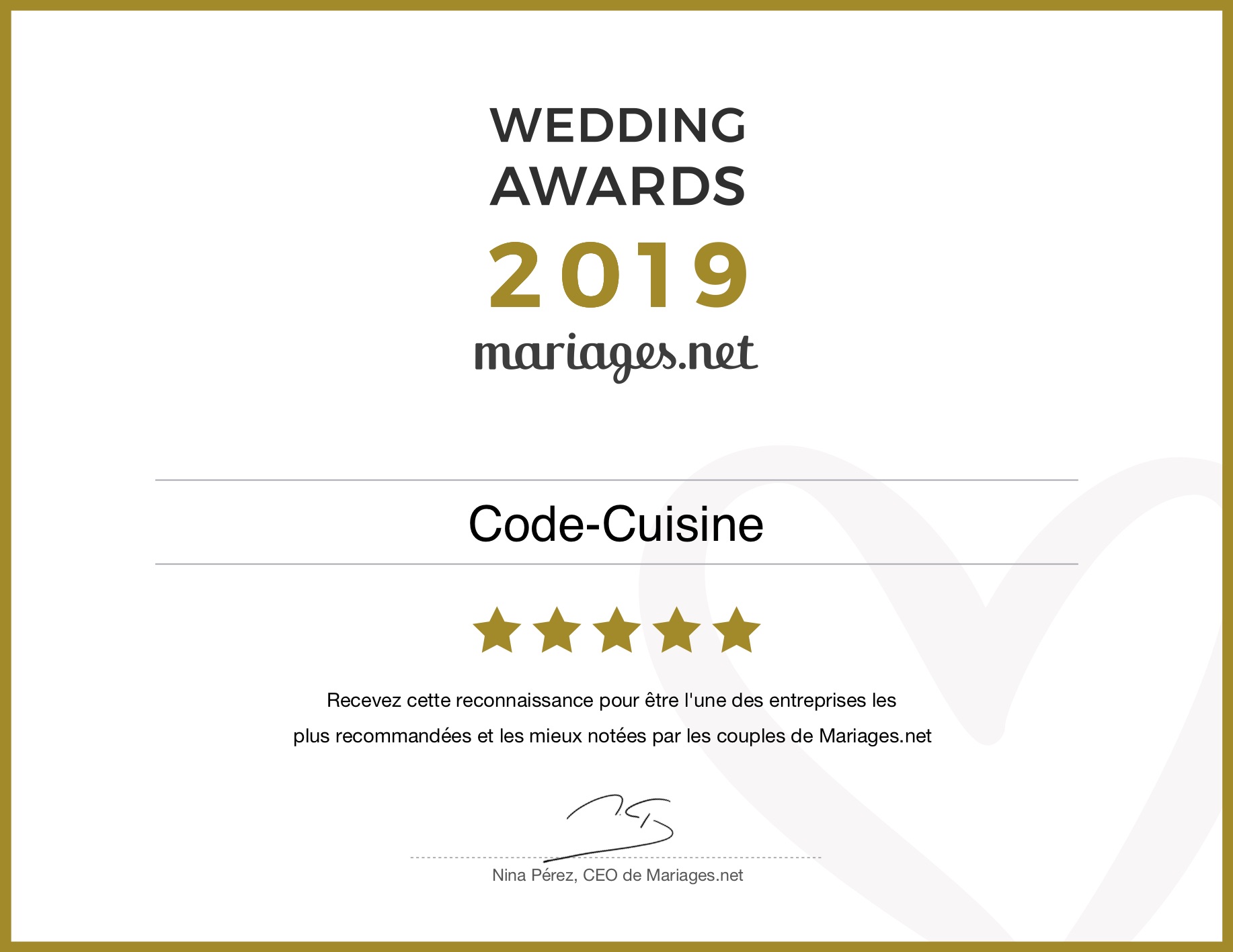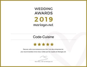 Code-Cuisine a reçu le prix du Wedding Awards 2019, la récompense la plus prestigieuse du secteur nuptial dans la catégorie Traiteur.