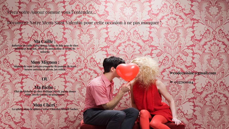 Menu Saint Valentin 9 janvier 201925 mars 2026Actualités Réservez dès à présent votre Menu Saint Valentin Disponible le 14, 15, 16 Février en retrait à Cosnes et Romain ou Livraison possible. Réservation jusqu’au : 12 février 18h00 pour le 14 février 13 février 18h00 pour le 15 février 14 février 18h00 pour le 16 février @:*protected email*